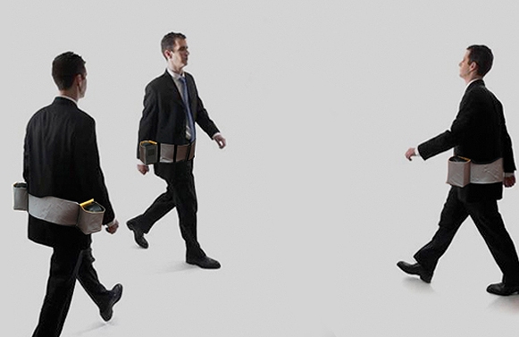 Five people walking around, each one wearing a belt with two loudspeakers in it. The 30’ soundtrack describes different walking experiences.