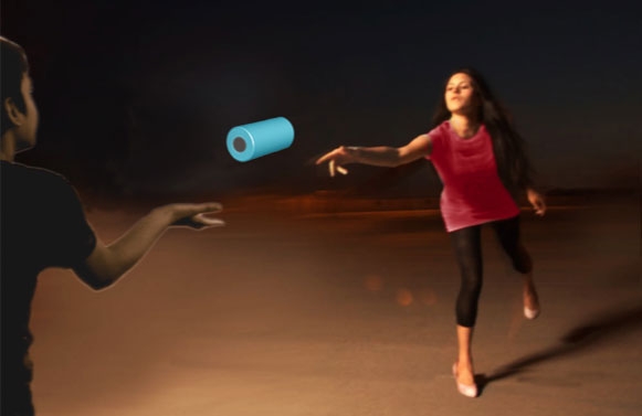 Blue, red and yellow cylinders emitting recorded words are thrown back and forth by dancers. Each cylinder has a loudspeaker embedded inside it, linked to a digital sound player. No Audio Available